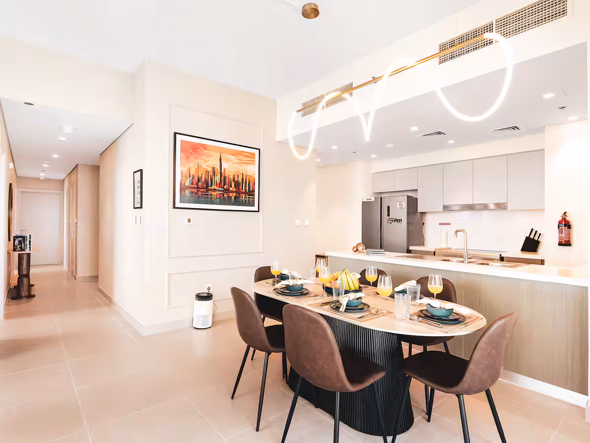 • Gourmet Kitchen: A fully equipped, modern kitchen with high-end appliances and sleek finishes is perfect for preparing meals, from light snacks to gourmet dinners. Enjoy family meals with stunning views of the city skyline and fountains.